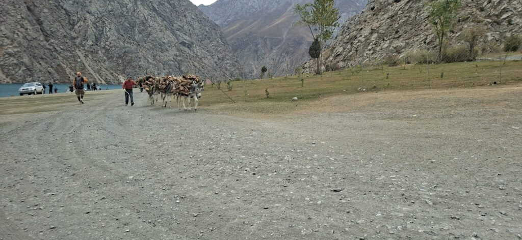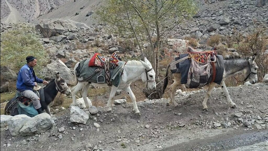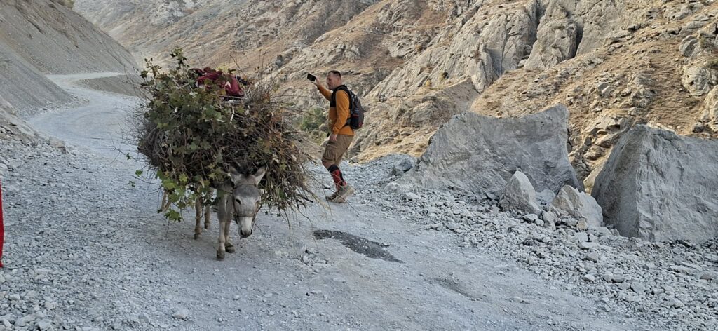 Gdy my na tej wąskiej ścieżce szliśmy prawie przyklejeni do skały pełni obaw o nasze bezpieczeństwo, chwilę potem obok nas przejechał miejscowy wieśniak z czterema okulbaczonymi do granic możliwości osiołkami. Okazało się, że za jeziorem mieszka jeszcze piętnaście rodzin. Ci ludzie mieszkający na końcu świata muszą przebyć parogodzinną drogę w dół doliny do najbliższego sklepu by zabezpieczyć sobie byt.