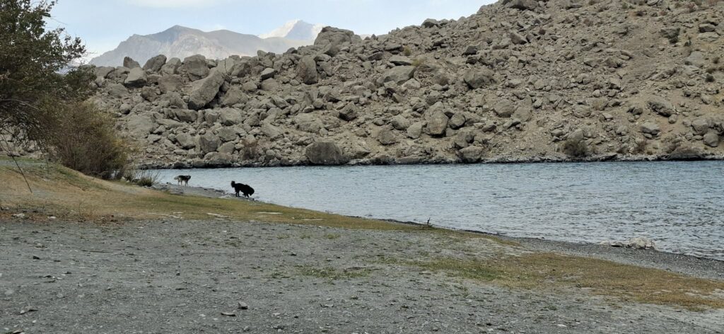 Przed wyruszeniem w drogę powrotną usiedliśmy za kilkoma krzakami trochę zatrzymującymi wiatr aby zjeść prowiant, który dostaliśmy od gospodyni na drogę. Oczywiście jak poprzednio: czerstwy chleb, jajka na twardo i twarde dzikie jabłka. Szybko pojawiło się towarzystwo – dwa duże psy biegające pomiędzy brzegiem jeziora a pobliskim pastwiskiem nauczone, że od turystów zawsze da się wymusić jakieś jedzenie – od tych mniej przyjaznych wymuszały jedzenie szczekaniem i groźną postawą. W pierwszej chwili nie czuliśmy się przy nich bezpiecznie, ale po pierwszym pogłaskaniu trudno było się od nich odczepić. Gdy zaczęliśmy jeść prawie wchodziły nam na głowy.