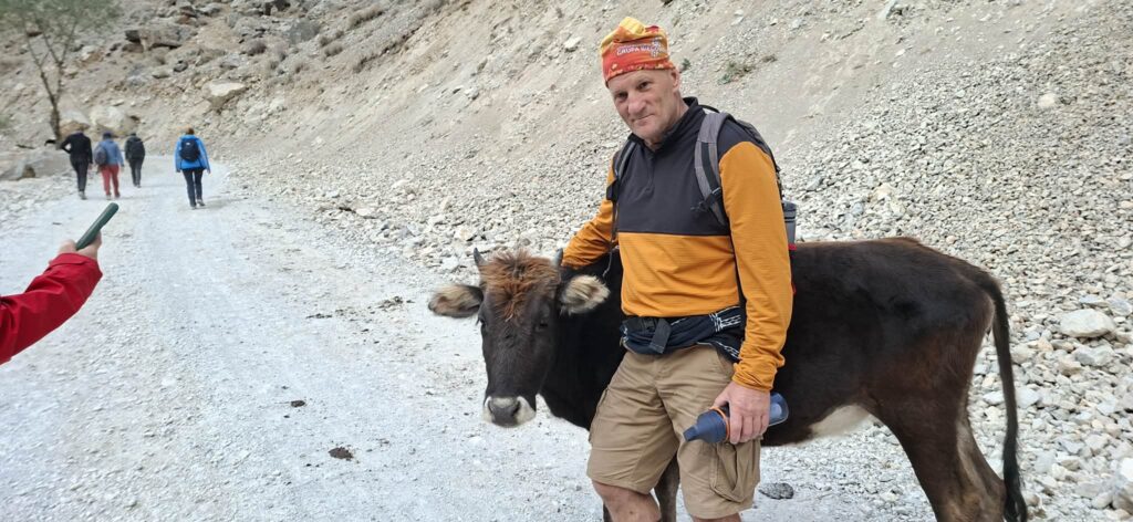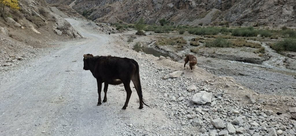 Podzieleni na grupki zmęczeni wracaliśmy do pensjonatu. W pewnym momencie przyłączyła się do krowa, a następnie młody pies. Towarzyszyły nam przez kilkaset metrów, dopóki nie wystraszyły ich kamieniami dzieciaki z wioski. Większość psów, które widzieliśmy w trakcie naszej podróży to były bardzo młode psy. Niestety chyba większość nie jest w stanie przeżyć tam zimy – gdy ruch turystyczny zamiera znika główne źródło pożywienia. W drodze minęły nas dwie ciężarówki Światowego Banku Żywności obładowane sianem – prawdopodobnie zapasem jedzenia na zimę dla zwierząt w dolinie. W warunkach tam panujących utrzymanie życia każdego zwierzaka jest wyzwaniem. Nikt się więc nie przejmuje życiem psa…