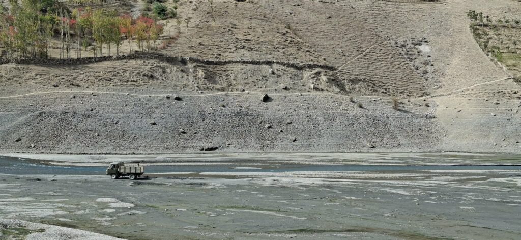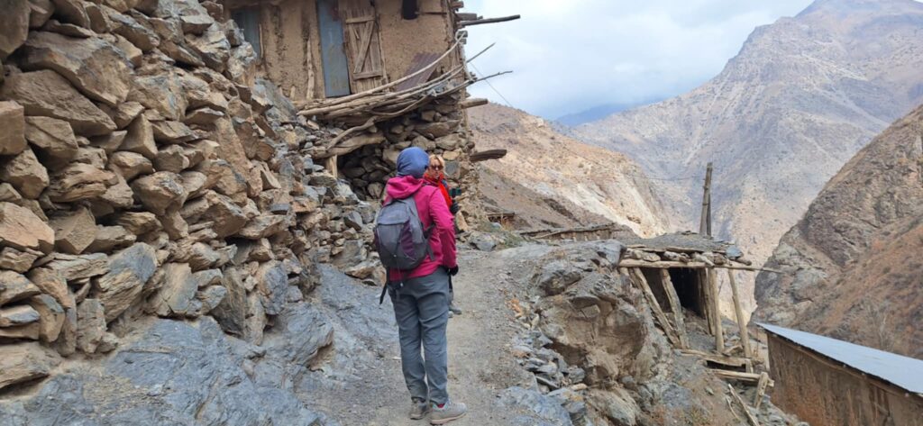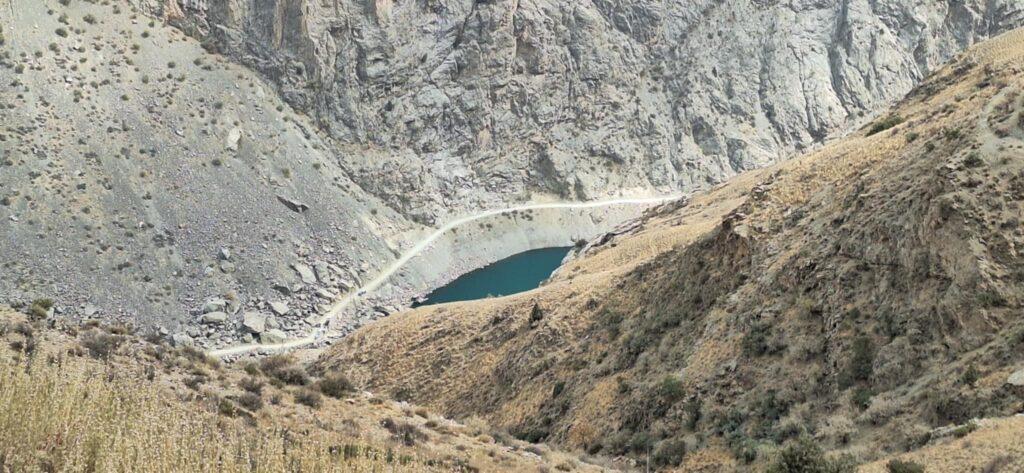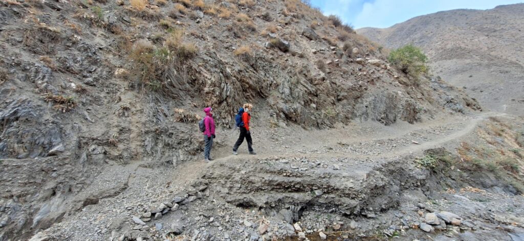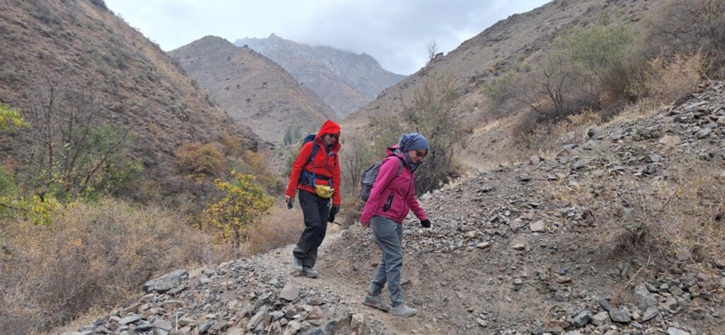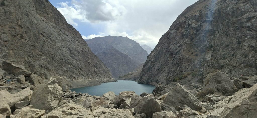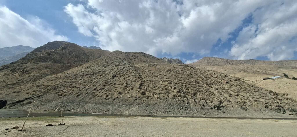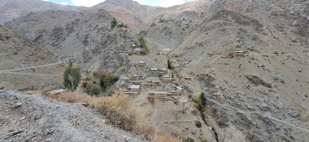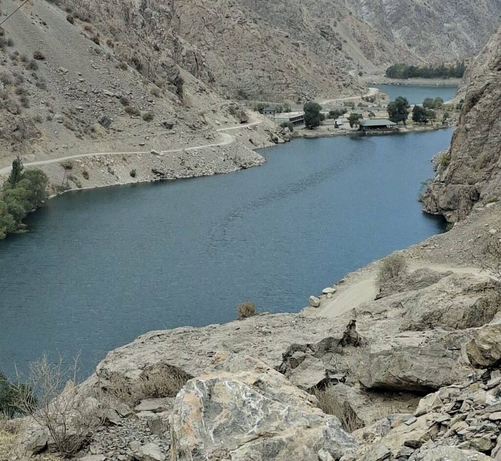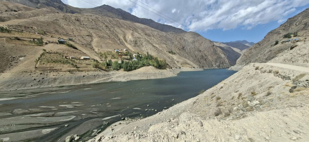 Droga wiodąca w dół kierowała nas przez górską rzeczkę w kierunku osady. Potok mniej więcej dziesięciometrowej szerokości pokonaliśmy skacząc po kamieniach wystających z nurtu. Za strumieniem ścieżka zaczęła się piąć w górę. Dziewczyny idąc obok jednej z zamieszkałych chat niespodziewanie zostały zaatakowane przez psa. Na szczęście skończyło się na szczekaniu i strachu. „Strażnik” pilnował obejścia i małej, około 10 letniej dziewczynki. Zatrzymaliśmy się przy pięknie usytuowanej ławce, widząc przed sobą wyminiętą przed chwilą osadę oraz całą piękną dolinę z wąwozem. Za naszymi plecami rozpostarty był ogromny masyw górski. Ten dzień i to miejsce oraz to co było poniżej przy potoku było kwintesencją całej Tadżyckiej przygody. Najlepsze chwile spędzone w tym kraju.